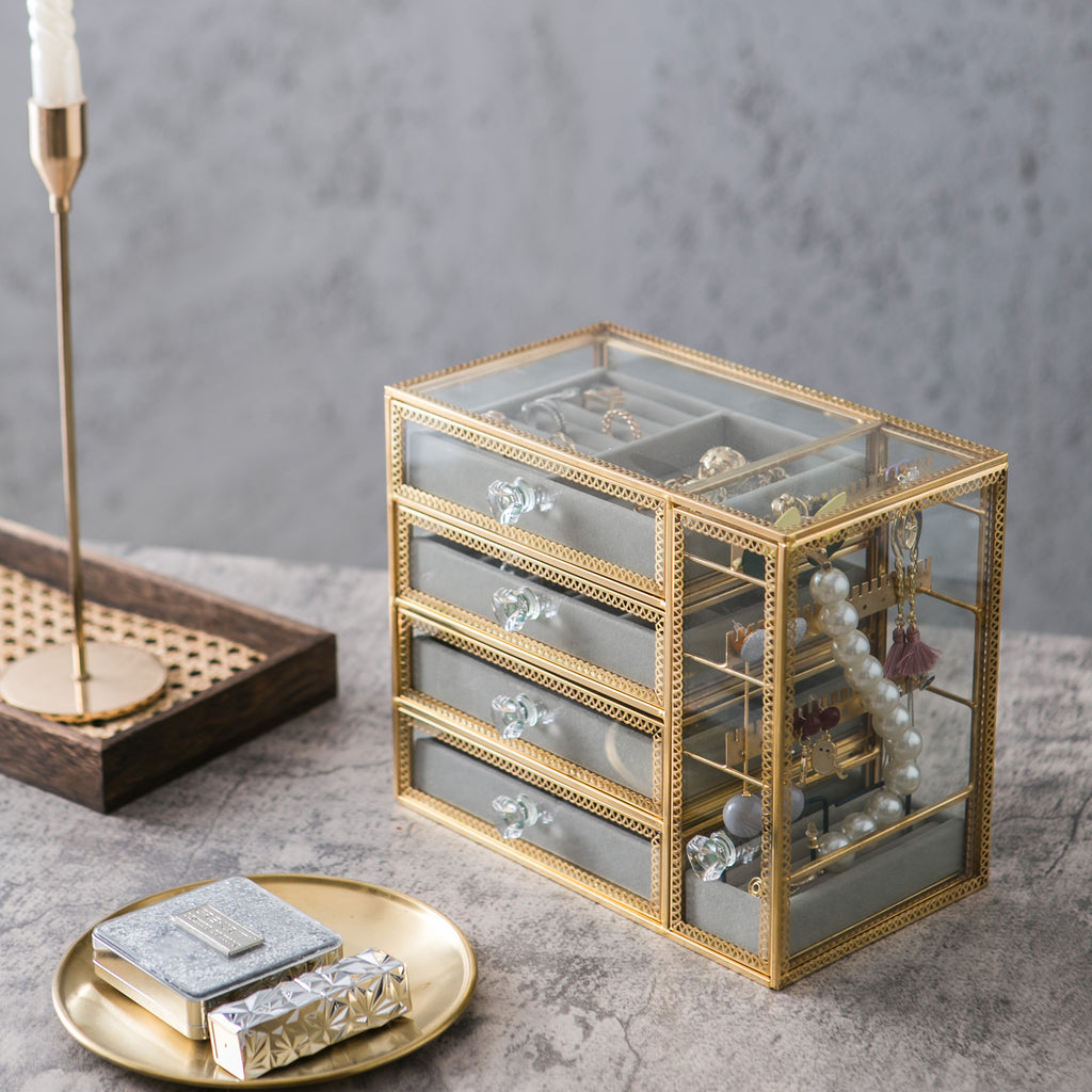 Elegant Glass Jewelry Box With Velvet Trays And Laced Edged Trim Gold Es Essentials